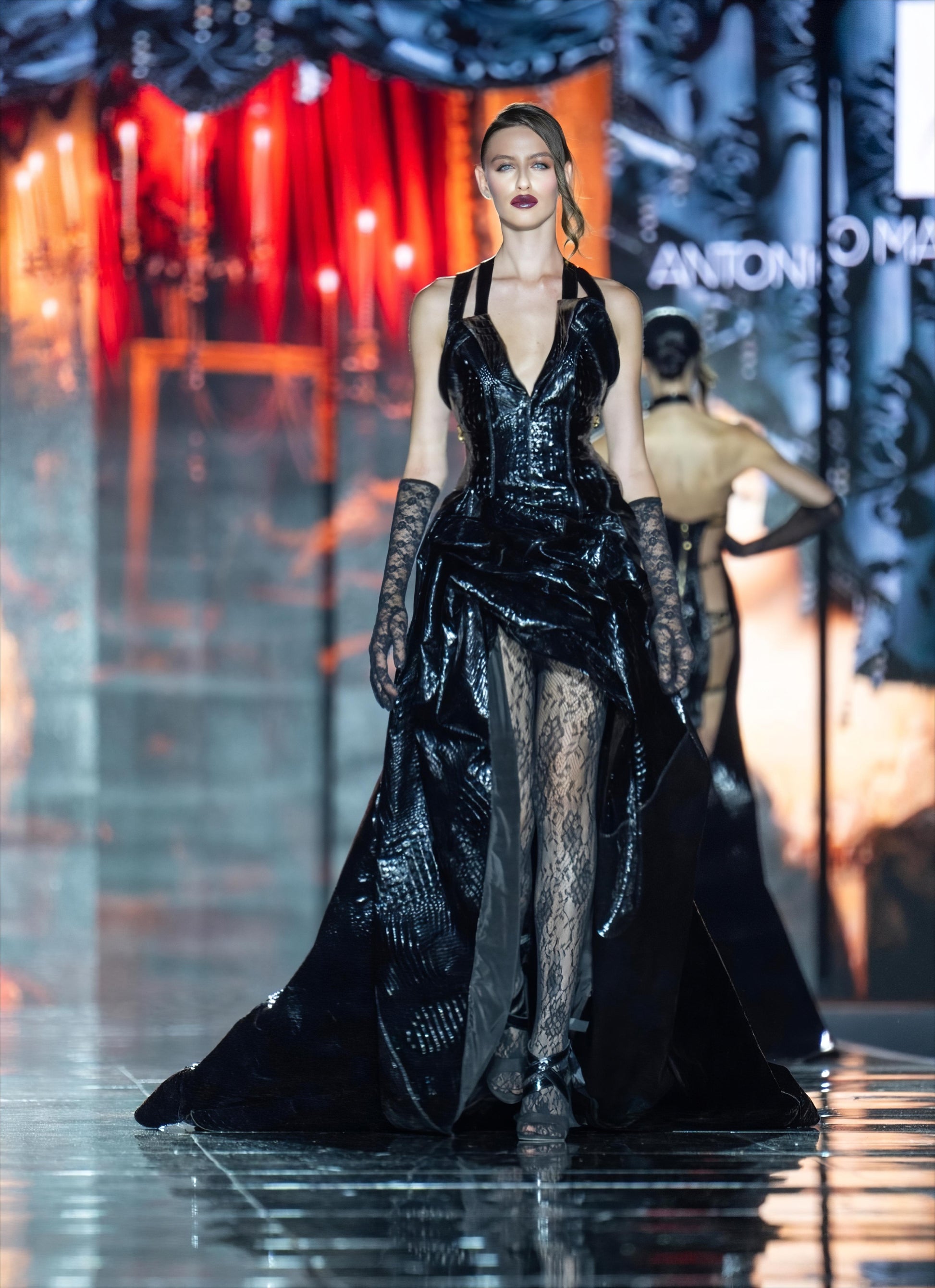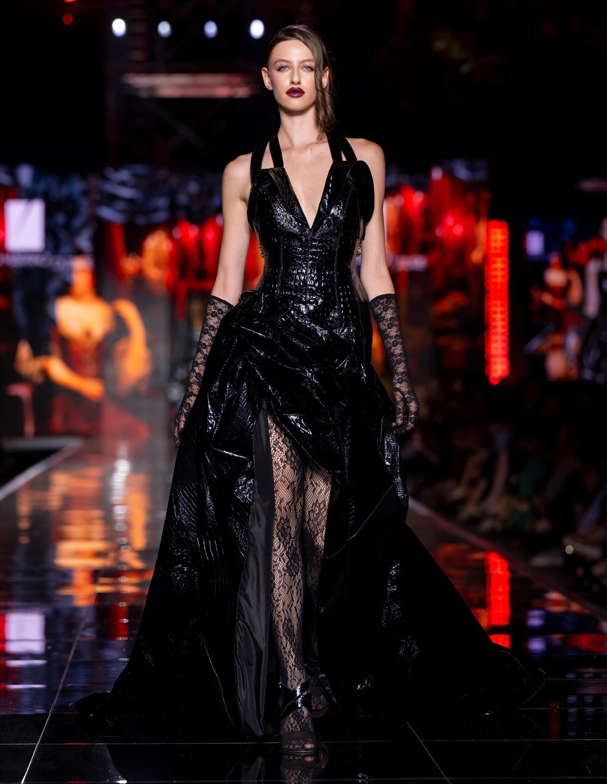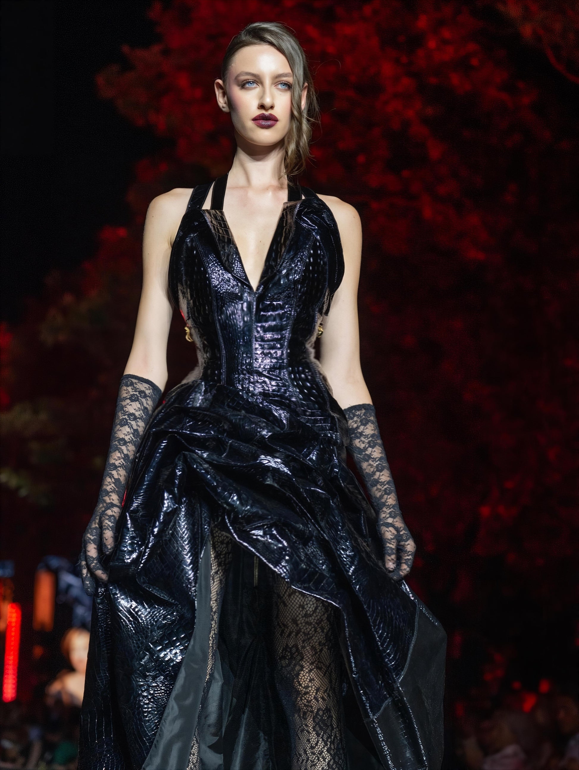 Abito da sera in pelle lucida effetto coccodrillo, caratterizzato da un bustier e un drappeggio asimmetrico anteriore. Presenta un ampio strascico, spalline regolabili con fibbie in metallo dorato e schiena scoperta con spalline intrecciate per un tocco sofisticato.