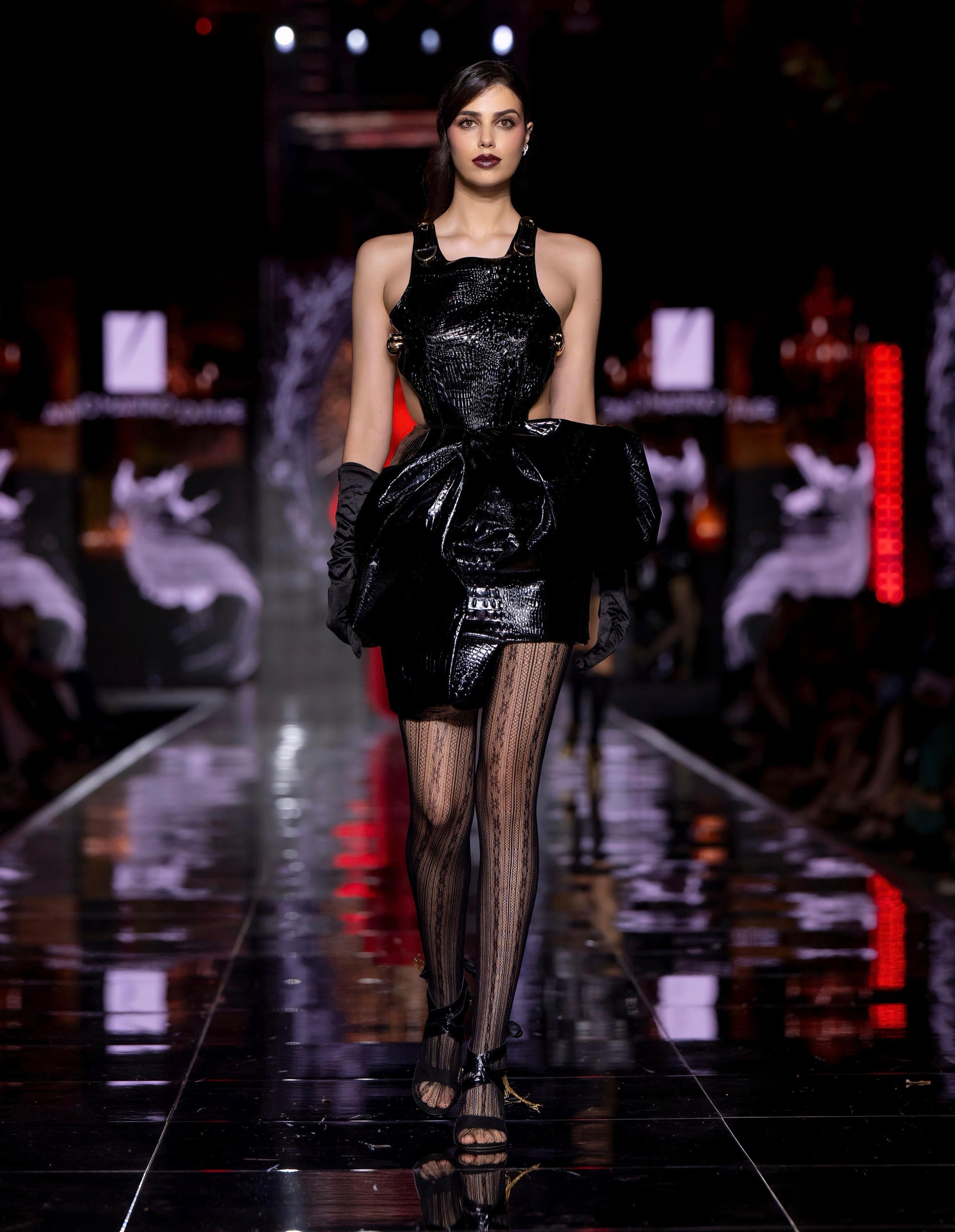Abito tubino corto in pelle lucida con stampa effetto alligatore, caratterizzato da un ampio drappeggio frontale e bretelle incrociate sulla schiena completate da dettagli in metallo dorato.