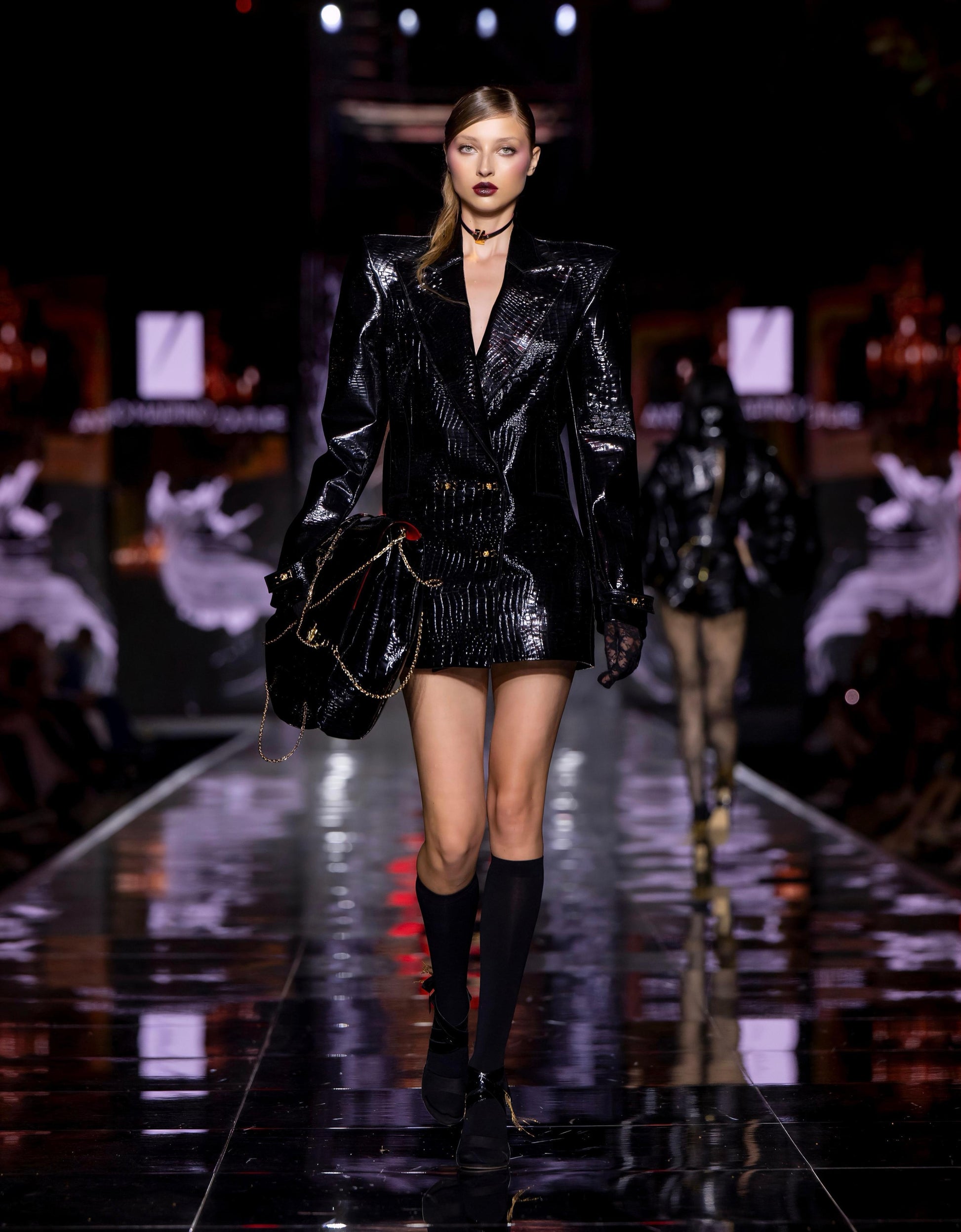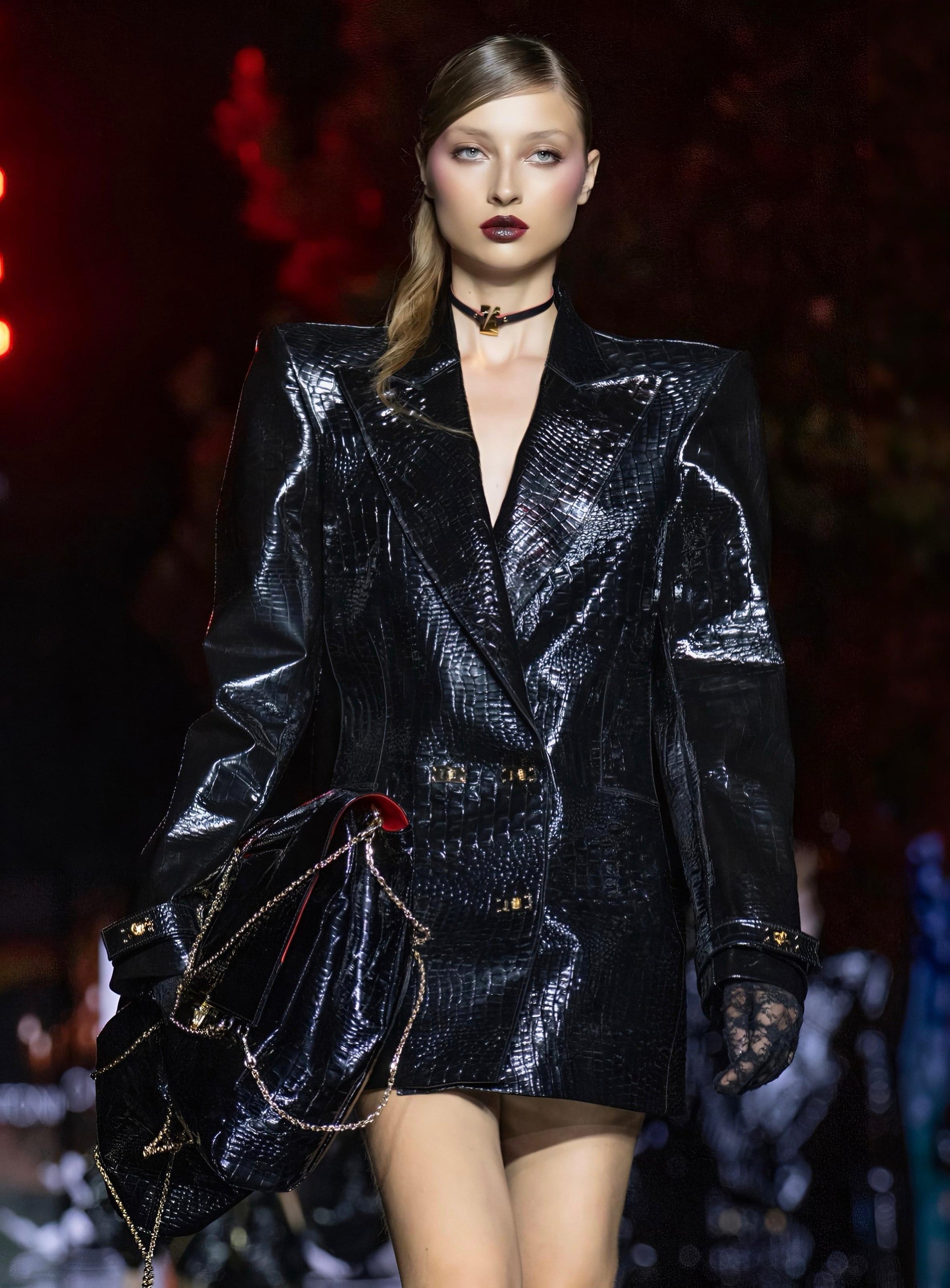 Giacca doppio petto in pelle nera lucida con effetto stampa alligatore, design minidress con spalle oversize e dettagli di chiusura in metallo dorato.